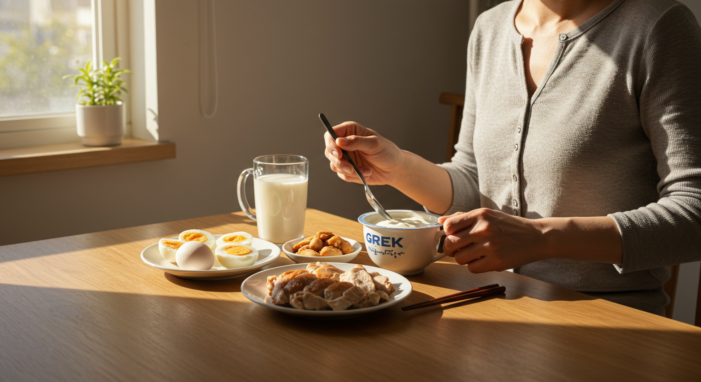 그릭요거트, 삶은 달걀, 닭가슴살, 저지방 우유